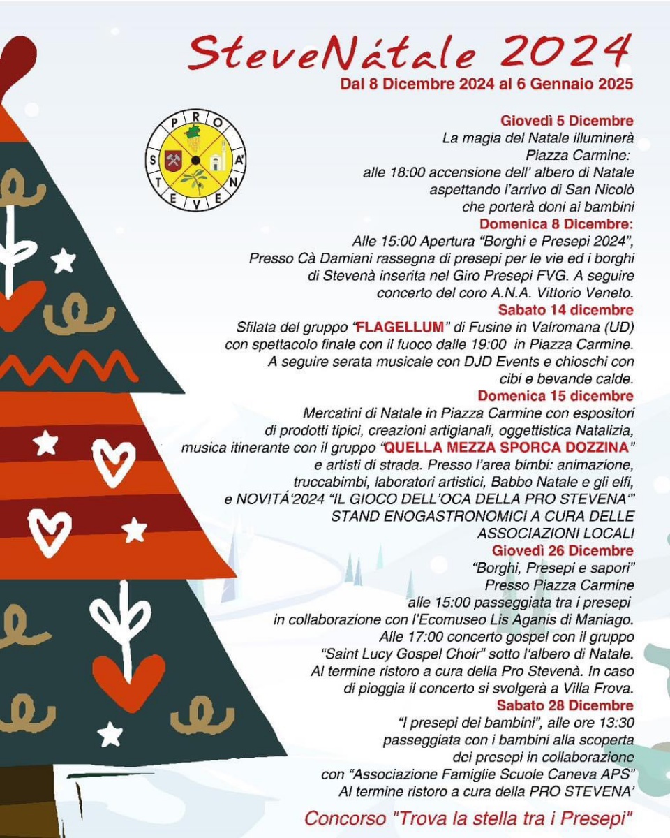 Inizierà una rassegna di presepi che si estenderà per le vie e i borghi di Stevenà, inserita nel Giro Presepi FVG. A seguire, concerto del coro A.N.A. Vittorio Veneto.