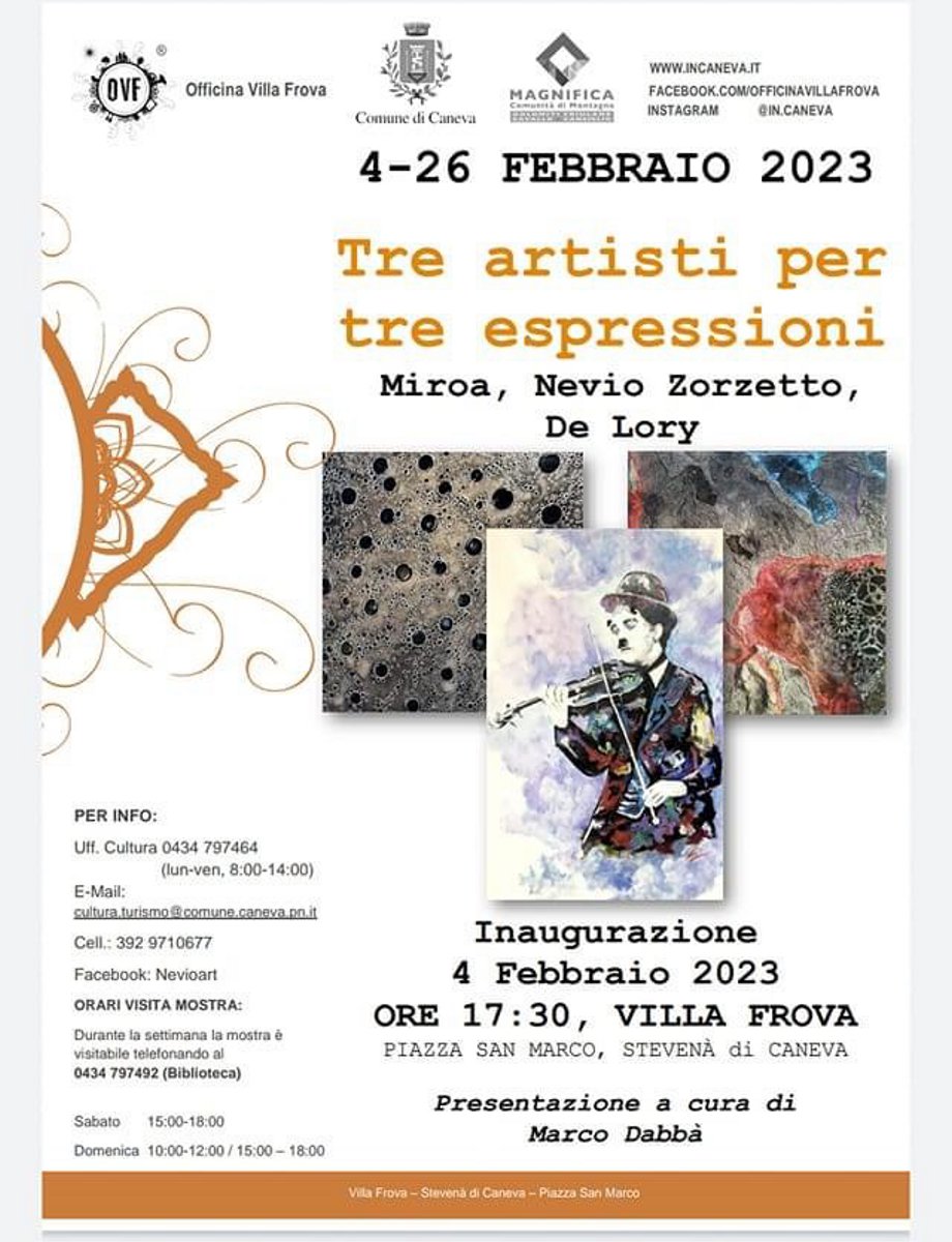 La mostra Tre artisti per tre espressioni Miroa, Nevio Zorzetto, De Lory, è stata predisposta presso Villa Frova da sabato 4 a domenica 26 febbraio 2023.