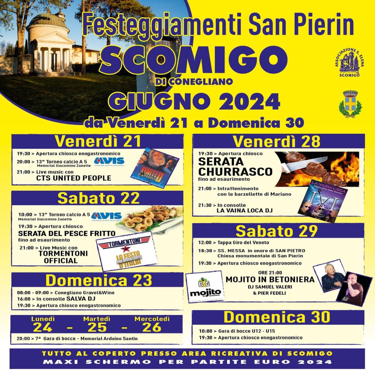 L’Associazione Sant’Elena Scomigo con il patrocinio del Comune di Conegliano, ha organizzato i Festeggiamenti San Pierin a Scomigo 2024 che si terranno dal 21 al 30 giugno 2024.