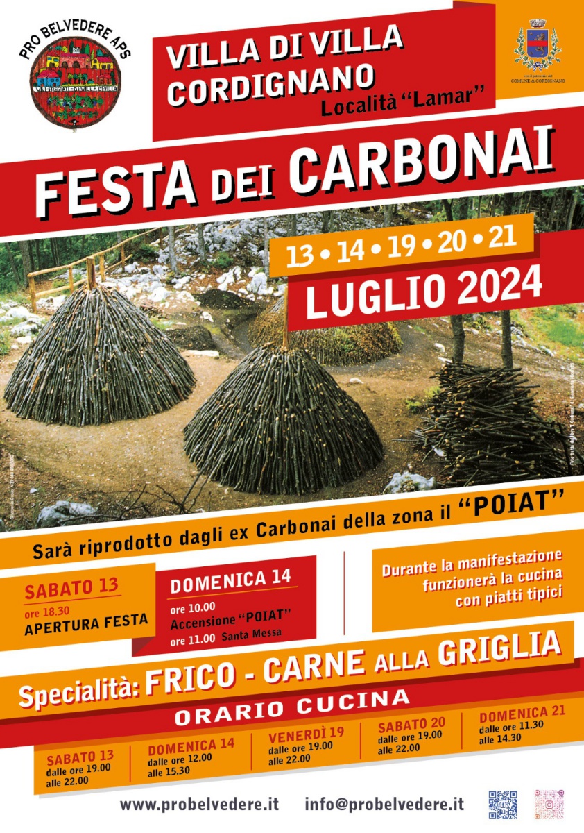 La Pro Belvedere di Villa di Villa ha organizzato la tradizionale Festa dei Carbonai 2024 che si terrà in località Lamar a Cordignano nei giorni 13-14-19-20-21 luglio 2024.