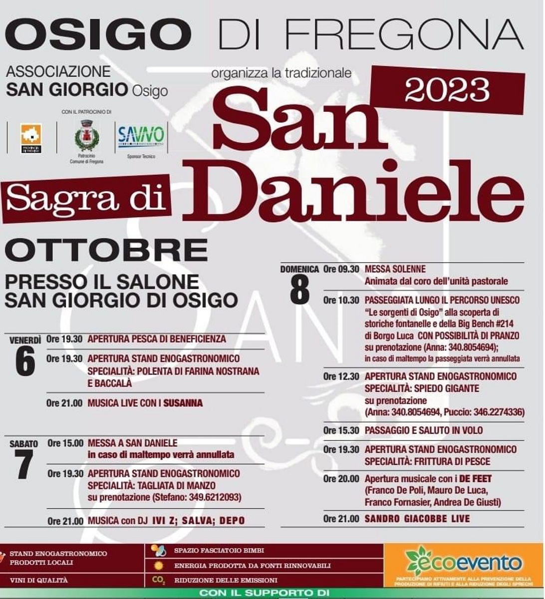 La Sagra di San Daniele si terrà nei giorni 6-7-8 ottobre 2023 ed è organizzata dall’Associazione San Giorgio Osigo con il patrocinio della Provincia di Treviso e dal Comune di Fregona
