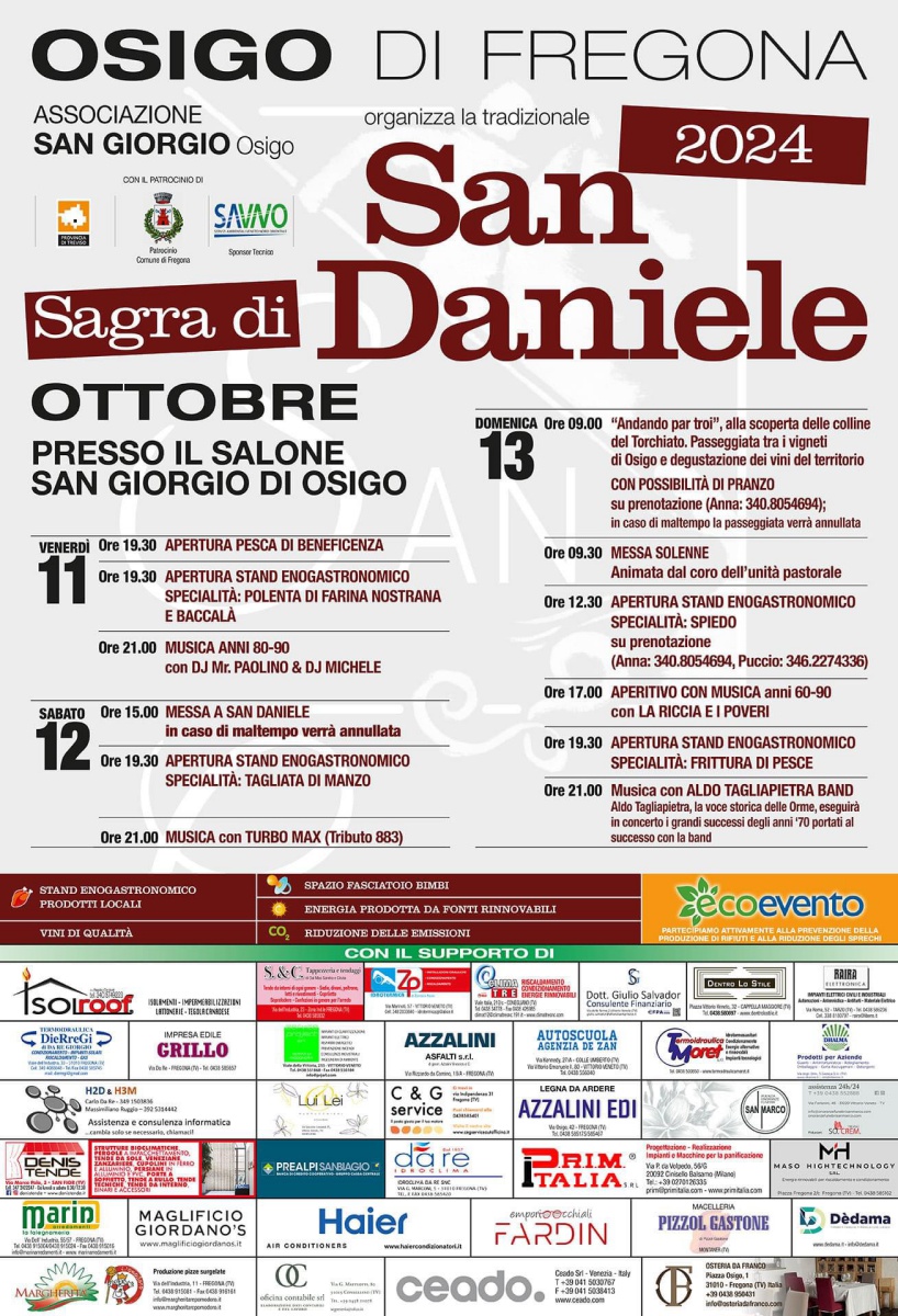 La Sagra San Daniele 2024 si terrà nei giorni 11-12-13 ottobre 2024 ed è stata organizzata dall’Associazione San Giorgio Osigo con il patrocinio della Provincia di Treviso e del Comune di Fregona.