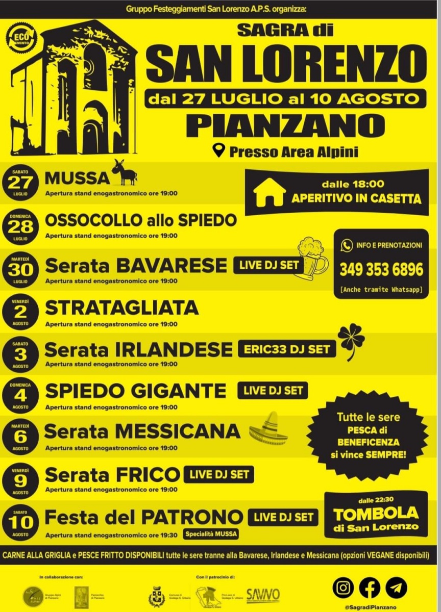 Il Gruppo Festeggiamenti San Lorenzo A.P.S. e la Parrocchia di Pianzano, con la collaborazione del Gruppo Alpini Pianzano ha organizzato la tradizionale Sagra di San Lorenzo 2024