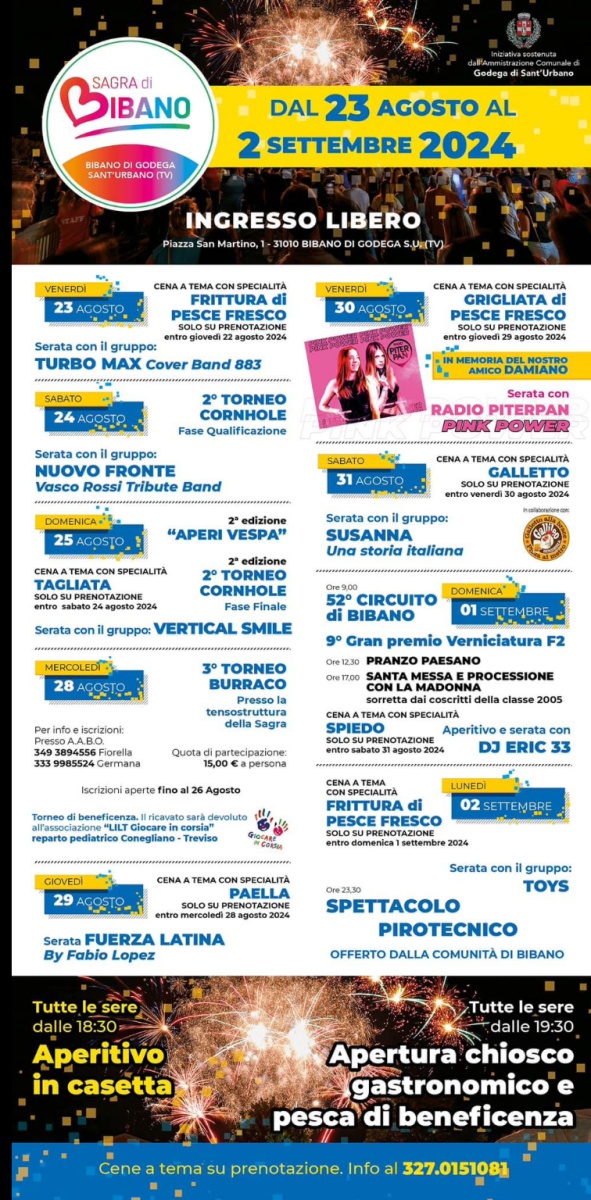 Il Comitato Festeggiamenti di Bibano con il sostegno del Comune di Godega Sant’Urbano e con il patrocinio della Regione Veneto ha organizzato la tradizionale Sagra di Bibano 2024.