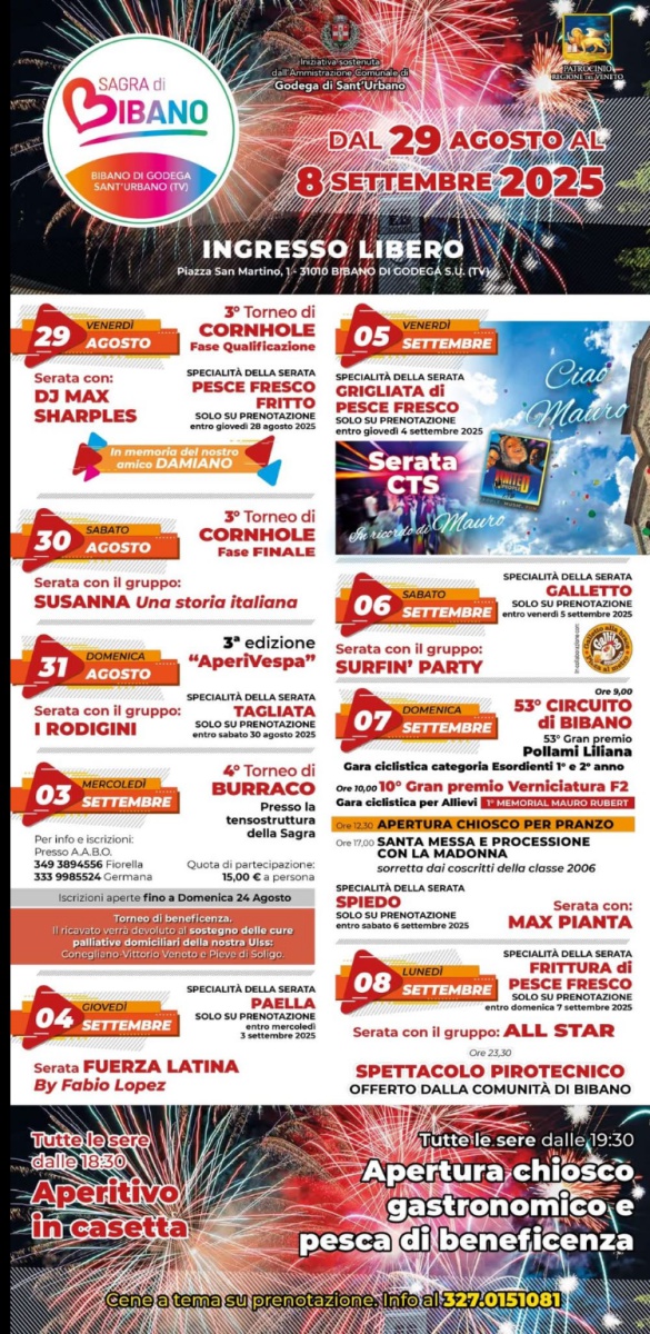Comitato Festeggiamenti di Bibano in collaborazione con il Comune di Godega Sant’Urbano e con il patrocinio della Regione Veneto ha organizzato la Sagra di Bibano 2025.
