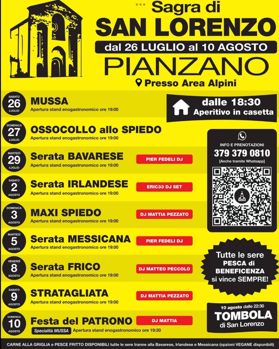 La Sagra di San Lorenzo o anche detta, dagli abitanti locali, Festeggiamenti di San Lorenzo a Pianzano si terrà dal 26 luglio al 10 agosto 2025 presso l’Area Alpini di Pianzano in via Sant’Urbano 2/A.