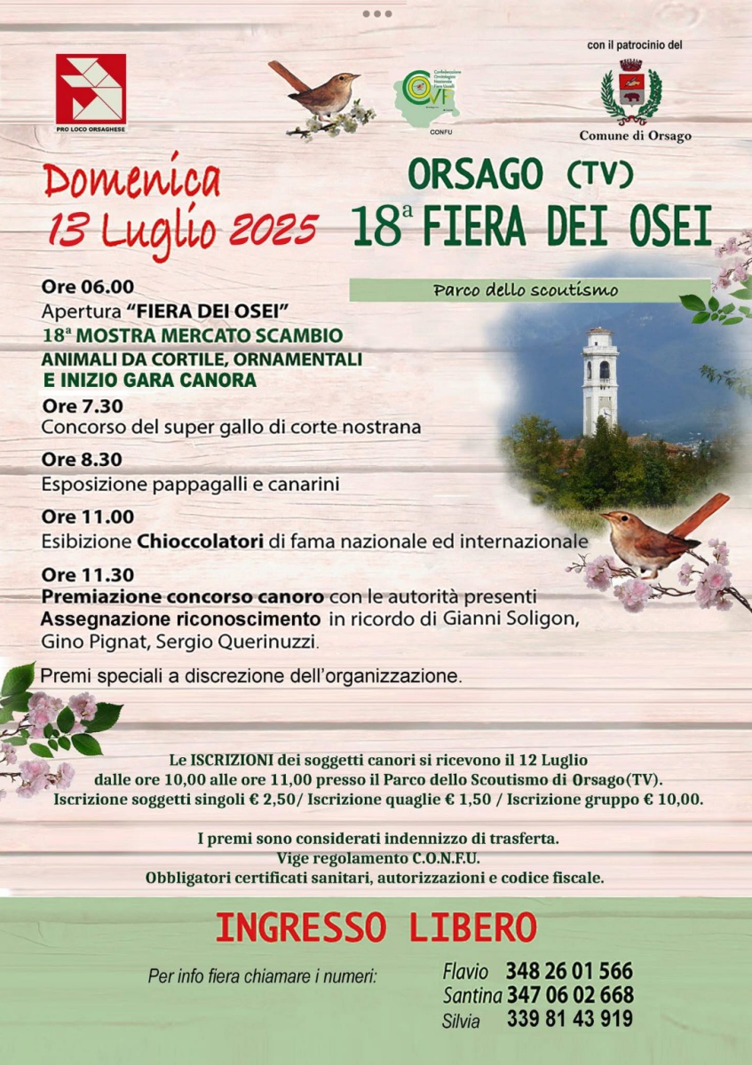 La Fiera degli Osei si terrà ad Orsago presso il Parco dello Scautismo domenica 13 luglio 2025.