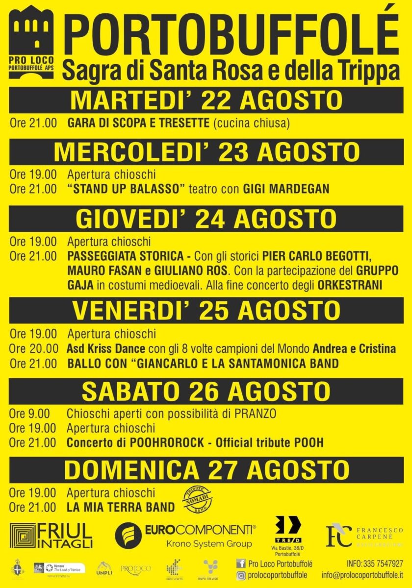 La Pro Loco di Portobuffolè APS, con il patrocinio del Comune di Portobuffolè ha organizzata la tradizionale Sagra di Santa Rosa e della trippa 2022 a Portobuffolè.