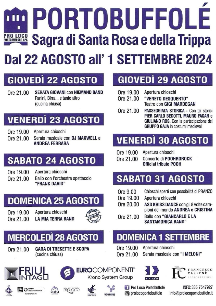 La Pro Loco Portobuffolè con il patrocinio del Comune di Portobuffolè ha organizzato la tradizionale Sagra di Santa Rosa e della trippa 2024. Evento molto sentito nel piccolo borgo medioevale di Portobuffolè.