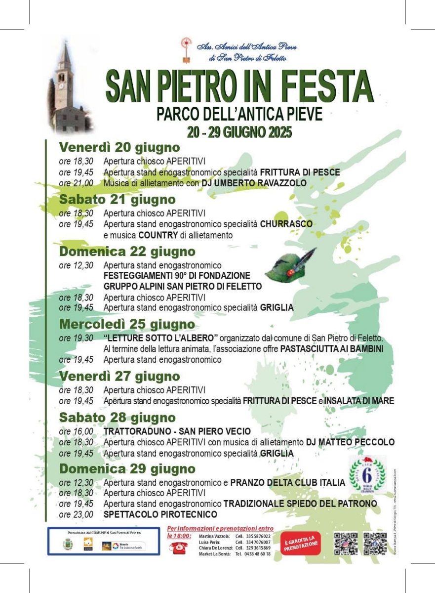 L’Associazione Amici dell’Antica Pieve di San Pietro di Feletto, con il patrocinio del Comune di San Pietro di Feletto, della Provincia di Treviso e della Regione Veneto ha organizzato San Pietro in Festa 2025.