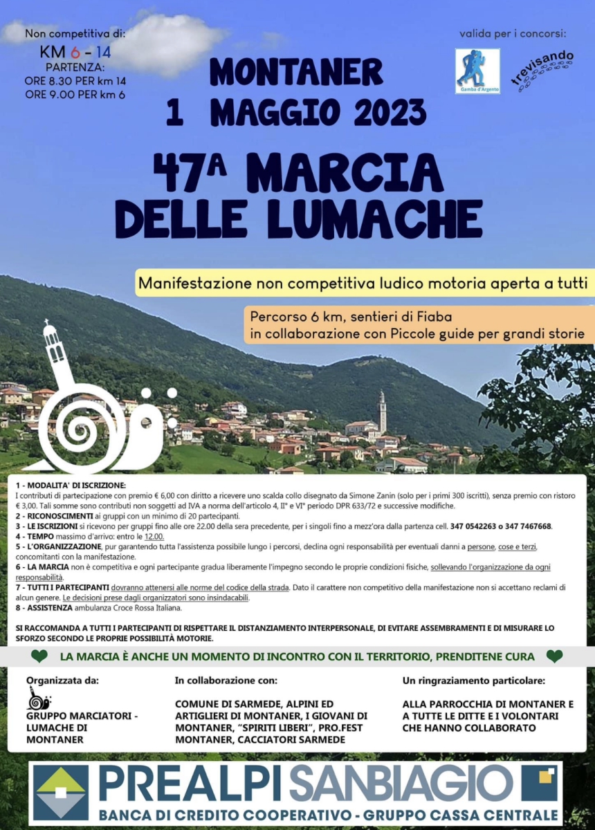 La Marcia delle Lumache si terrà lunedì 1° Maggio 2023 a Montaner. E’ valida per il concorso Trevisando.