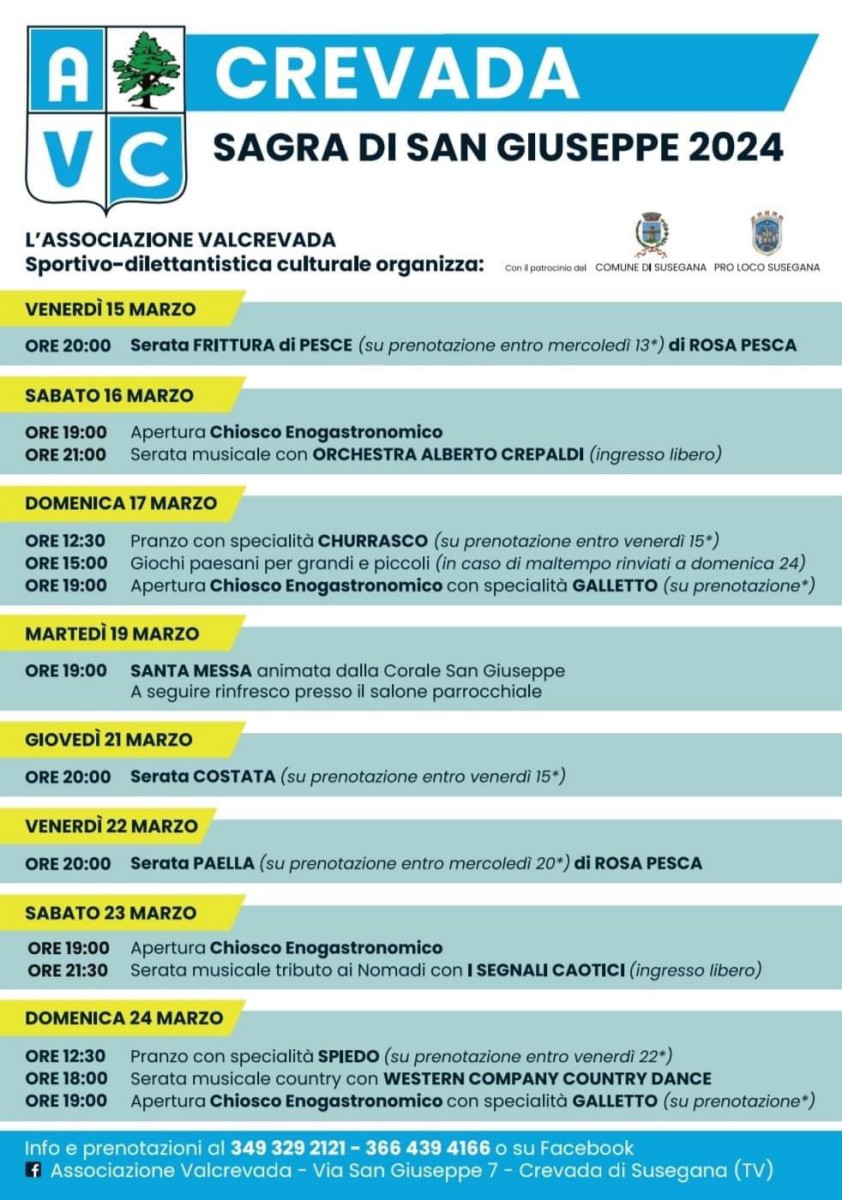 L’Associazione Valcrevada sportivo dilettantistica culturale, con il patrocinio del Comune di Susegana e con la collaborazione della Pro Loco di Susegana ha organizzato la Sagra di San Giuseppe 2024 a Crevada.