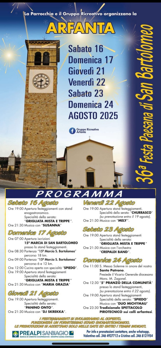 Il Gruppo Ricreativo di Arfanta con la collaborazione della Parrocchia di Arfanta di Tarzo ha organizzato la 36ª Festa Paesana di San Bartolomeo.