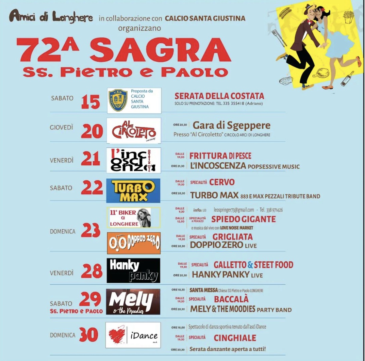Gli Amici di Longhere in collaborazione con il Calcio Santa Giustina organizzano la 72ª Sagra Santi Pietro e Paolo presso il Campo Sportivo di Santa Giustina.