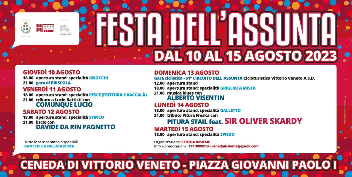 L’Associazione Ceneda Insieme con la collaborazione della Parrocchia Santa Maria Assunta nella Cattedrale con il patrocinio del Comune di Vittorio Veneto ha organizzato la Festa dell’Assunta 2023.