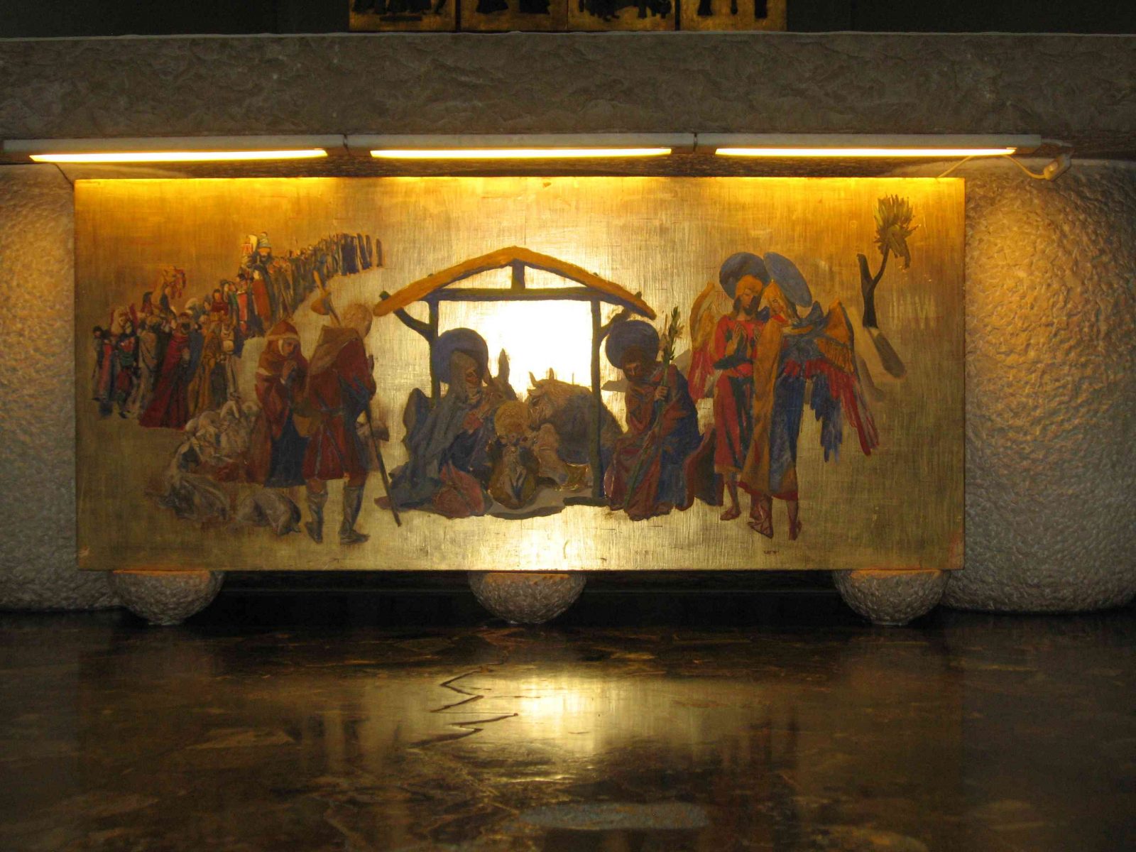 L’opera di Pino Casarini è collocata dietro l’altare maggiore, la pala raffigura l’Immacolata Concezione e le dieci tavole a corollario un momento della vita della Vergine: l’Annunciazione, la Presentazione al Tempio, lo Sposalizio, la Visitazione, le Nozze di Cana, la Crocifissione, l’Incoronazione, la Dormitio Virginis, l’Assunzione e la Pentecoste.