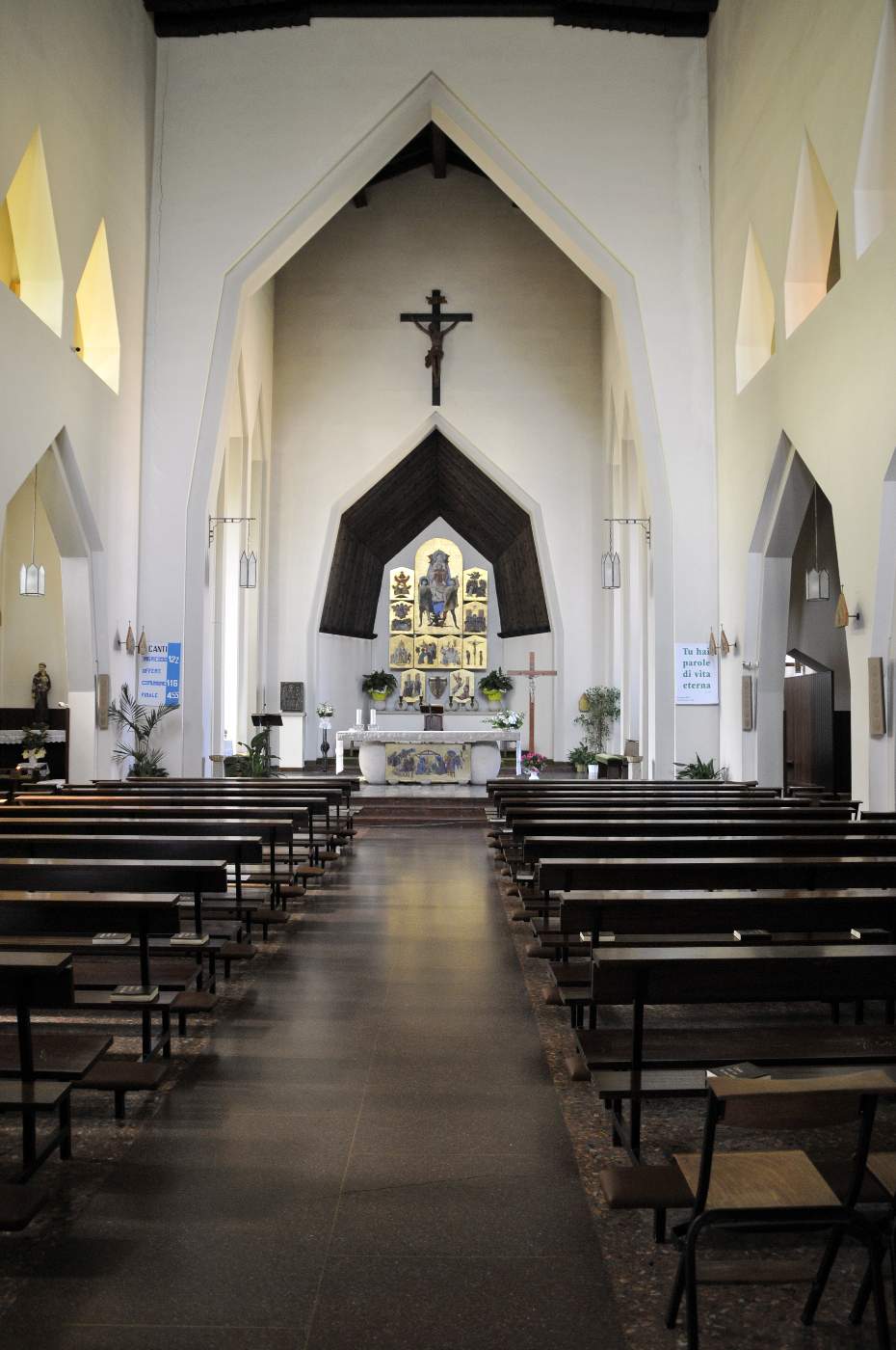 L’architettura moderna offre una reinterpretazione delle cattedrali gotiche e l’interno a una navata lascia alla luce, proveniente dalle monofore, la creazione di atmosfere diverse nei vari momenti della giornata.