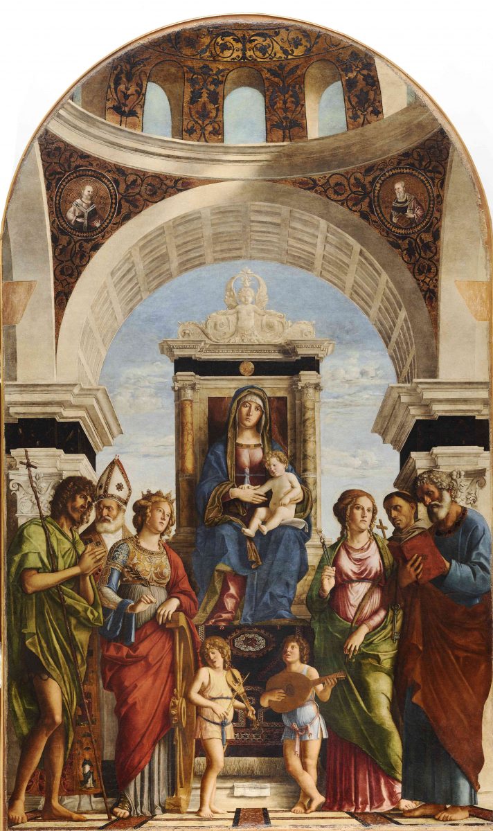 La chiesa ospita notevoli opere d’arte: la pala d’altare collocata nel presbiterio, recentemente restaurata, fu eseguita da Giambattista Cima da Conegliano nel 1493 e raffigura la Madonna col Bambino e angeli, tra i santi Giovanni Battista, Nicola, Caterina d’Alessandria, Apollonia, Francesco e Pietro. Di notevole interesse è anche il dipinto di Francesco Beccaruzzi, artista coneglianese vissuto nel sec. XVI, raffigurante San Francesco che riceve le stigmate, nella parte superiore, e i Santi Luigi, Bonaventura, Caterina d’Alessandria, Girolamo, Antonio e Paolo, nella parte inferiore. Degna di nota è anche la grande tela di Jacopo Palma il Giovane (1544 — 1628) raffigurante Santa Caterina battezzata dall’eremita, collocata sulla controfacciata sopra la porta d’ingresso. Nella prima cappella a sinistra, ove è posto anche il fonte battesimale proveniente dalla chiesa di Arfanta, è visibile il dipinto raffigurante Il Battesimo di Cristo di Francesco Frigimelica (1570 circa — post 1649), proveniente dall’antica chiesa di San Giovanni Battista che si trovava in Borgo Madonna. Altra opera di pregevole fattura è la scultura quattrocentesca del Cristo crocifisso di cui non si hanno notizie certe, ma che risente dell’influenza di modelli devozionali di tradizione nordica. Sopra la porta laterale destra, inoltre, vi è una tela raffigurante San Marco tra i santi Leonardo e Caterina d’Alessandria, attribuita alla fase iniziale dell’attività di Francesco Beccaruzzi.