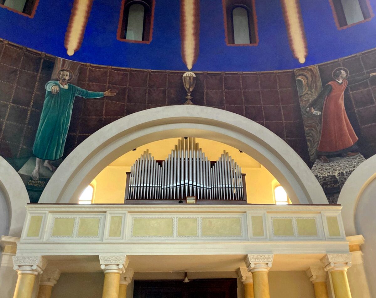 Il Cadorin si mise al lavoro per il cielo blu della cupola avvalendosi dell’aiuto del pittore Zanzotto Giovanni di Pieve di Soligo e padre del noto poeta Andrea. Pure una scritta in latino tratta dagli Atti degli Apostoli ci illustra la scena della Pentecoste: “Seditque supra singulos eorum, et repleti sunt omnes Spiritu Sancto, et coeperunt loqui Apostoli variis linguis magnalia Dei, prout Spiritus Sanctus dabat eloqui illis” (Atti 2, 3-4).