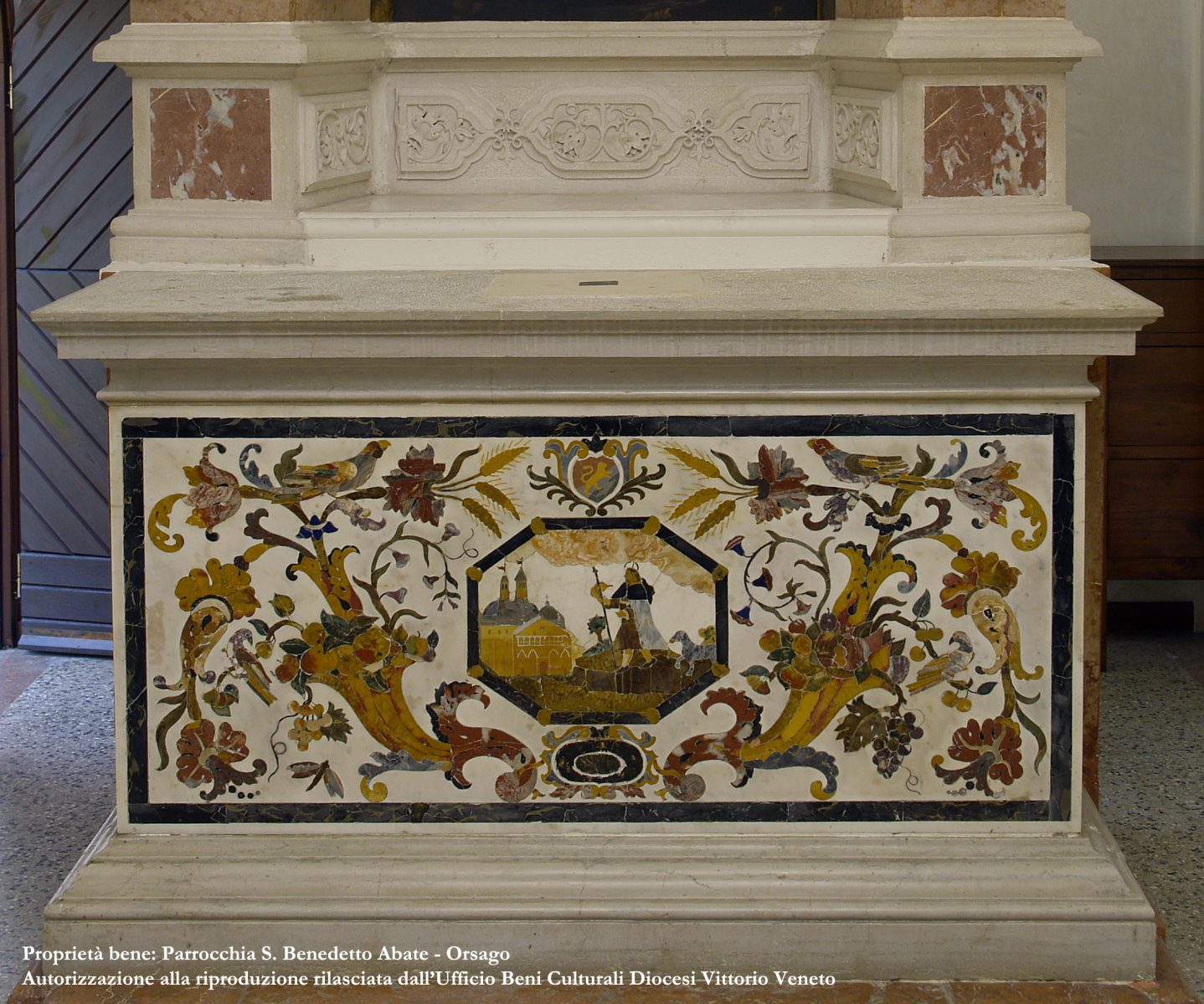 All’interno, il paliotto dell’altare in pietra e marmi policromi presenta al centro un riquadro mistilineo con un’immagine di Sant’Antonio da Padova affiancata dalla basilica patavina del Santo; il resto della superficie è occupato da una decorazione a motivi vegetali molto articola che riporta anche lo stemma nobiliare.