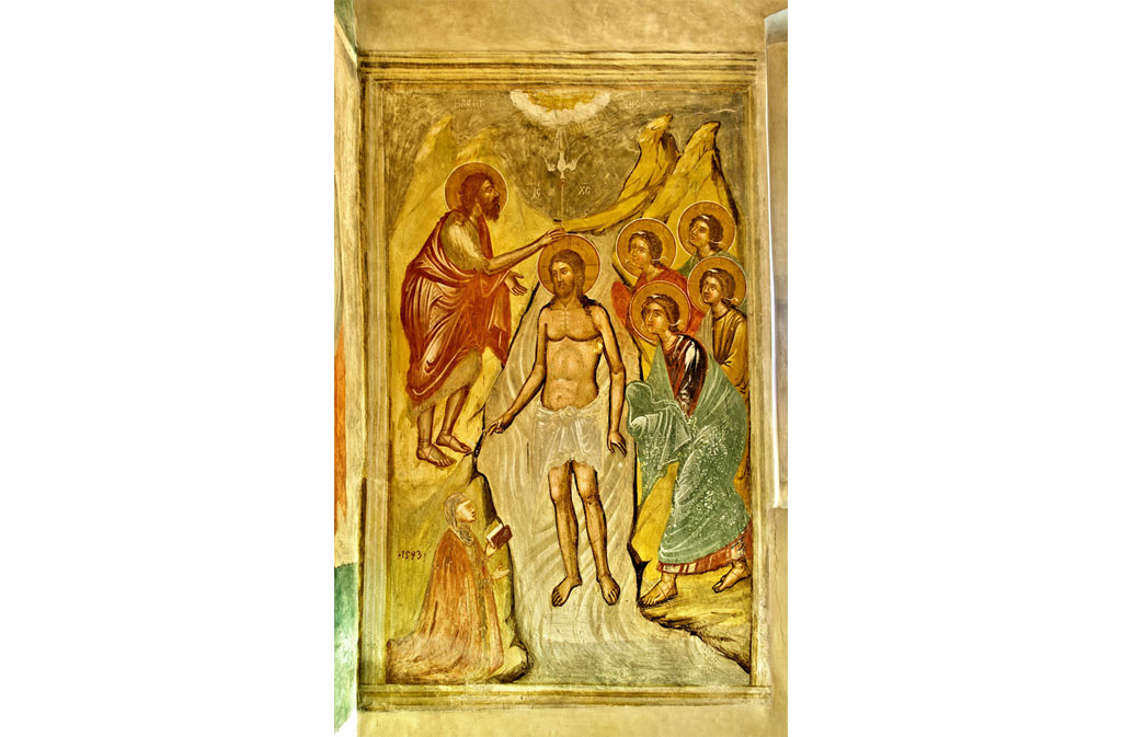 All’interno si possono ammirare preziosi affreschi post bizantini attribuiti alla scuola veneto-cretese del XVI secolo: sopra l’arco trionfale a tutto sesto che conduce all’altare si trova raffigurato Dio Padre con ai lati l’Angelo annunziante e la Vergine Maria, più sotto sono affrescate le immagini dei Santi Apostoli Pietro e Paolo. Sulla parete destra c’è il Battesimo di Gesù al Giordano in cui è presente una figura inginocchiata di donatore con libro in mano e con la data del 1593.