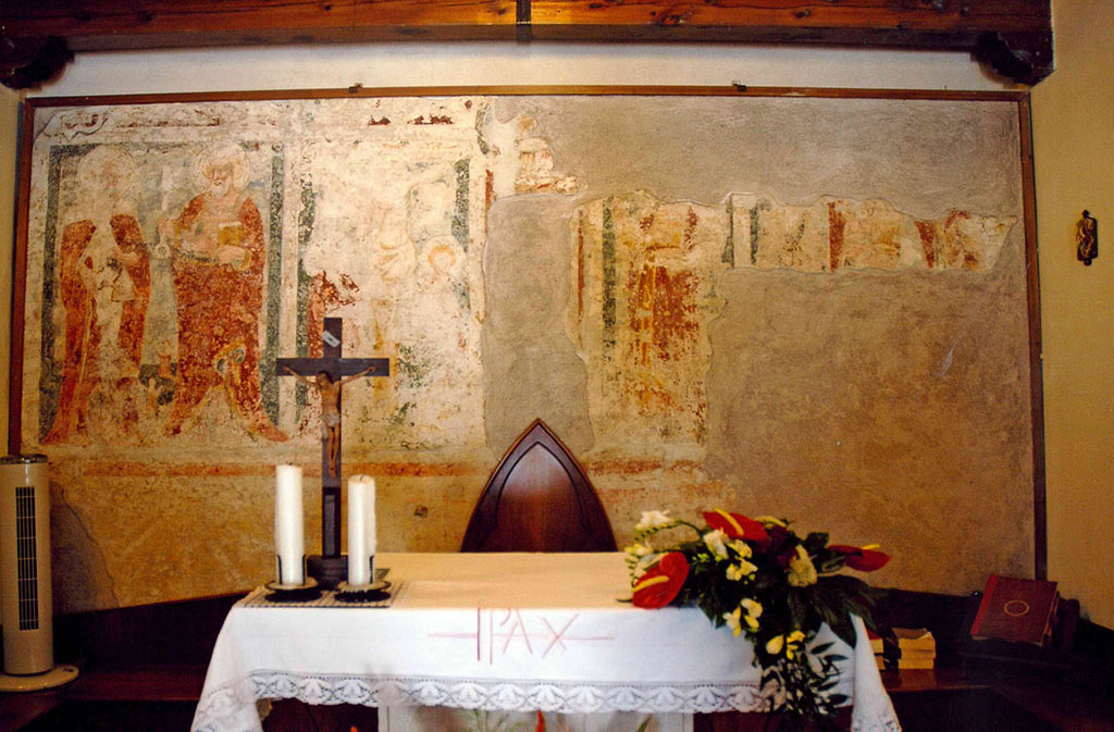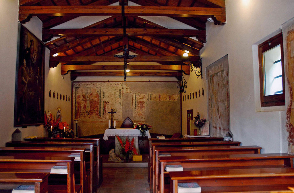 All’interno della chiesa sono ancora visibili affreschi del XIV secolo, opere di valore storico che ritraggono una crocifissione e ai lati le figure di santi oltre ad un affresco che raffigura San Sebastiano.