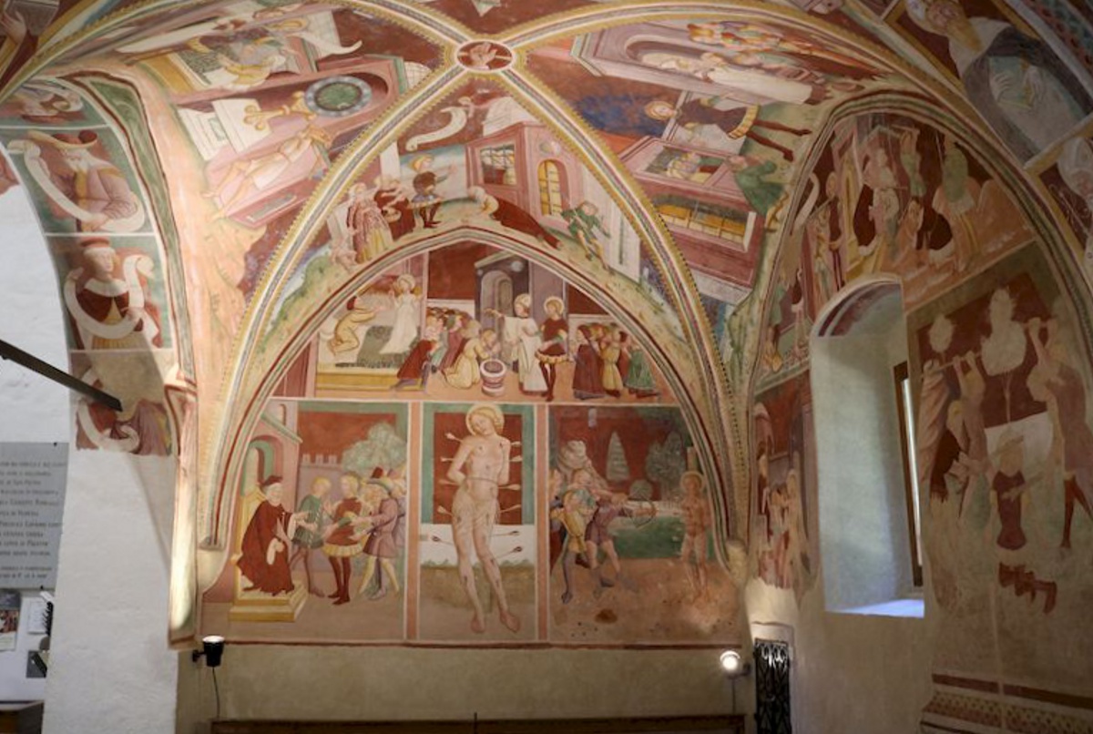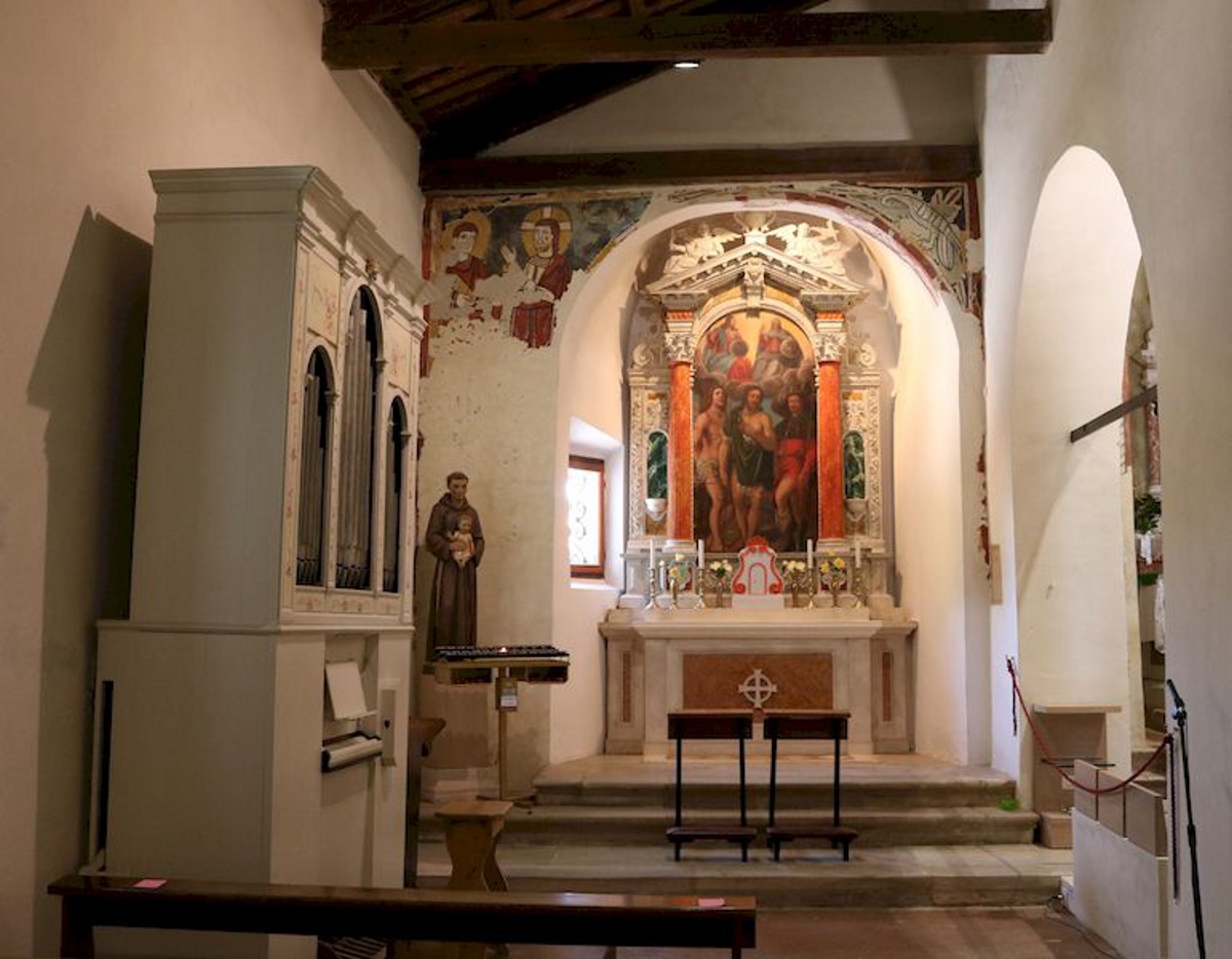 Nell’abside piccolo è possibile notare la scena del Cristo risorto che mostra le ferite all’Apostolo Tommaso. Nella parete di destra, vi è la figura di Sansone e i dodici articoli del Credo ossia il Simbolo Apostolico.