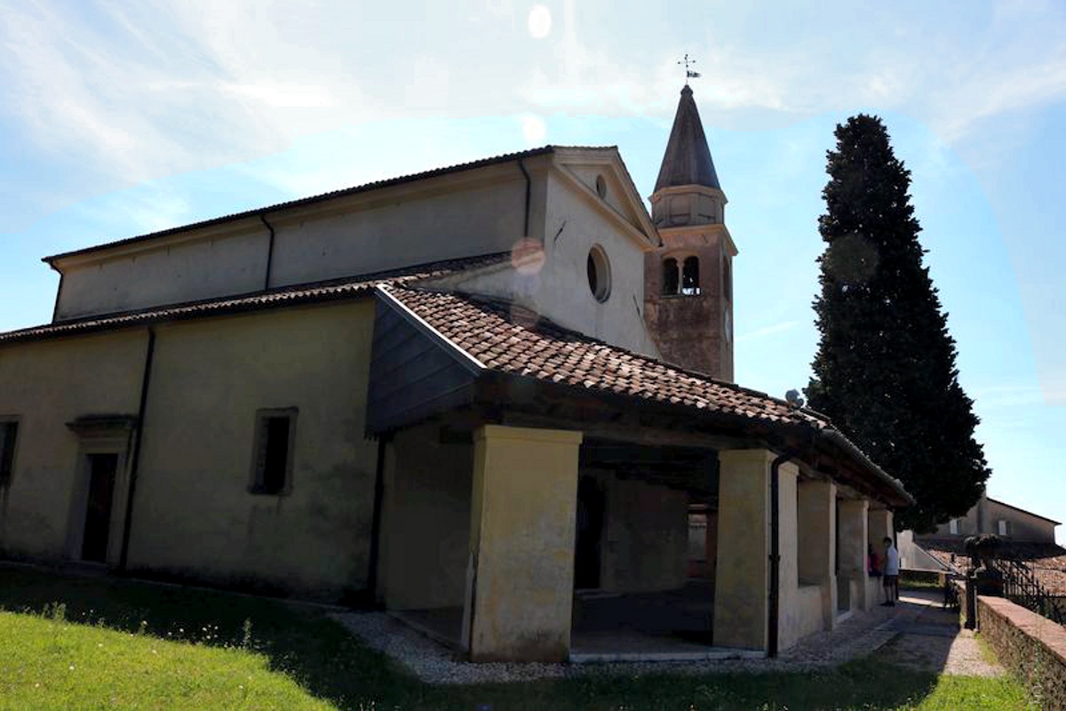 La chiesa che guarda a sud è ben visibile dalle Colline del Prosecco Conegliano Valdobbiadene Patrimonio Unesco, perché collocata sulla sommità di un colle.