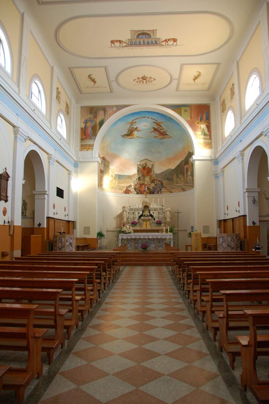 Il pavimento policromo e le aperture collocate in alto assicurano una atmosfera luminosa all’edificio religioso.