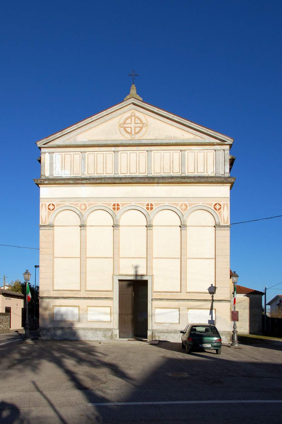 Nella facciata sono rappresentate delle colonne di ordine dorico con alcuni motivi geometrici, altre identiche a queste si trovano nella trabeazione. Nel transetto è raffigurata una croce greca.