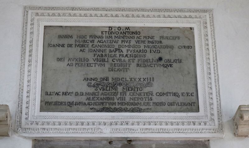 Una lapide, tradotta in italiano, posta sopra la porta ricorda quanto segue: “A Dio Ottimo Massimo e al Santo Antonio – questo tempio minacciante rovina e quasi cadente Marco Agazzi veramente pio Pastore – essendo fabbricieri Giovanni Del Giudice canonico – Domenico Moscardini curato – e GioBattista Fusari – con l’aiuto di Dio con cura costante e con le oblazioni dei fedeli – condusse a termine e completato lo dedicò nell’anno del Signore 1693 all’eccelso merito dell’Ill.mo e Rev.mo Marco Agazzi vescovo di Ceneda e conte di Tarzo – nipote di papa Alessandro VIII – i fabbricieri soprannominati a proprie spese questa lapide eressero a perpetua memoria”.